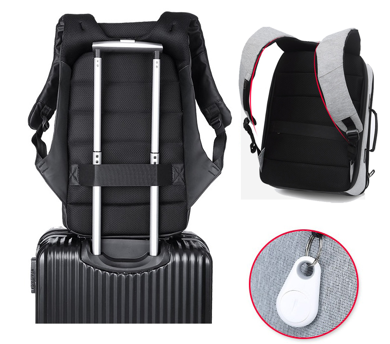 Phần lưng balo và quai đeo được thiết kế 1 lớp lưới đệm vừa thoáng khí – chống sốc tốt – tính đàn hồi cao, có thêm dây đai gắn cố định trên cần kéo vali thuận tiện di chuyển.