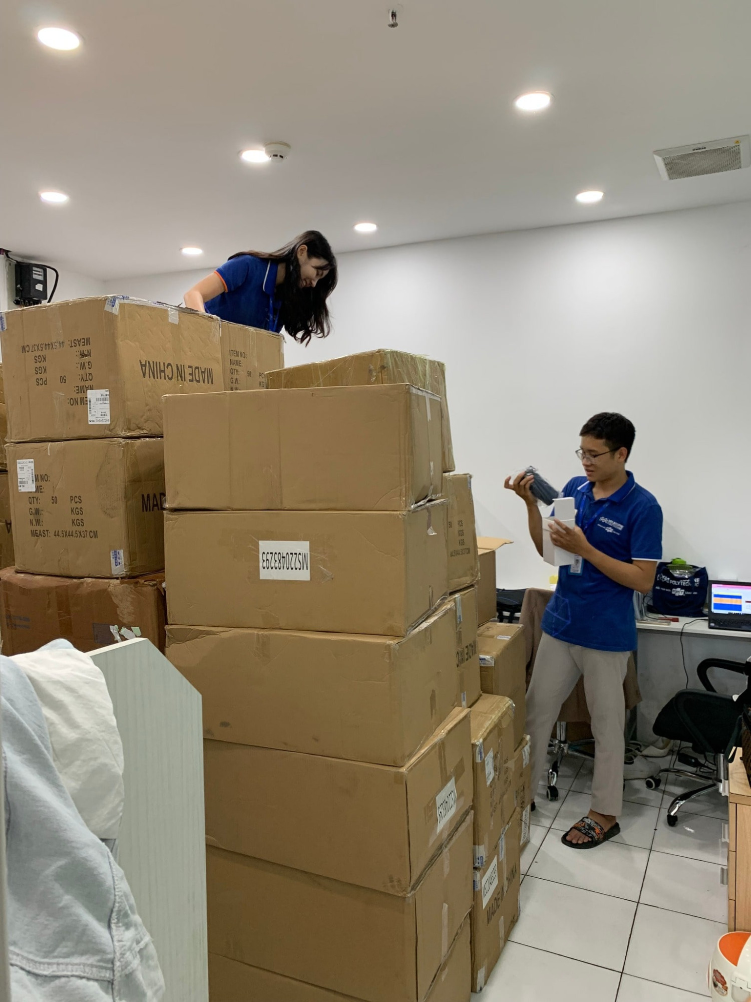 Kho để hàng cùng nhân viên kiểm tra tỉ mỉ từng sản phẩm