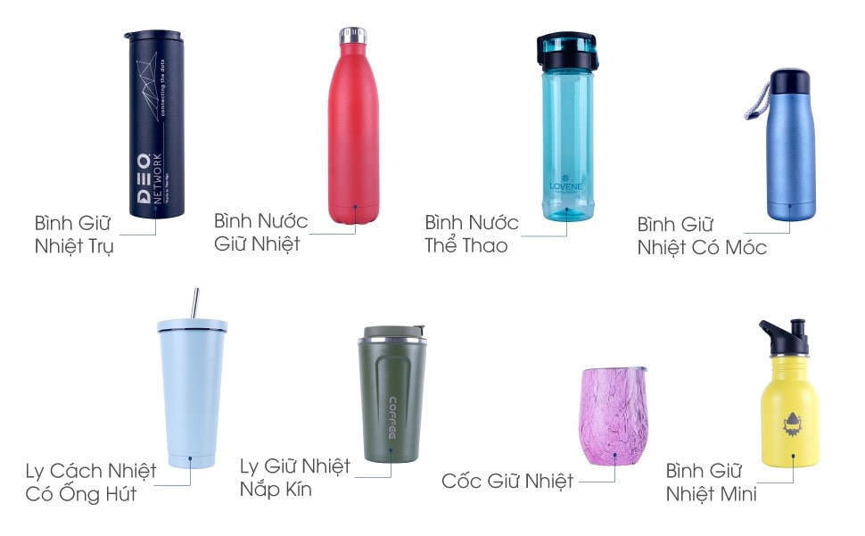 – Bình nước inox: Bình có nhiều loại dung tích khác nhau như 500ml, 1 lít, 1.5 lít… thuận tiện để mang đi học, đi làm. Chất liệu inox cao cấp giúp bình có khả năng giữ nhiệt một cách hiệu quả. Và với một cấu tạo nhiều lớp cách nhiệt, lớp chân không cách nhiệt giữ cho phía ngoài bình được khô ráo, không đọng nước.