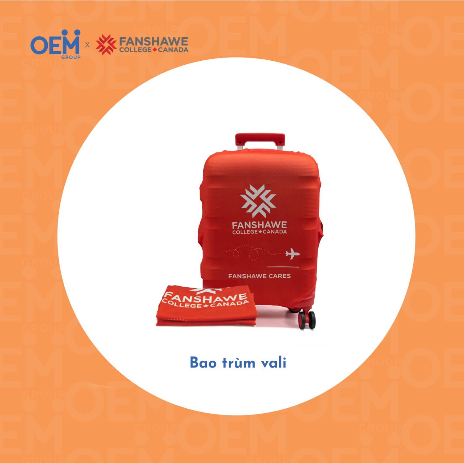 Fanshawe College là trường cao đẳng toàn diện ở Ontario, Canada, cung cấp các cơ hội học tập và giáo dục để phát triển bản thân, đáp ứng nhu cầu thị trường lao động. Trường giúp sinh viên khai phá tiềm năng trong nhiều lĩnh vực nghệ thuật ứng dụng, kinh doanh, chăm sóc sức khỏe,… để họ có thể bộc lộ được năng lực của mình. OEM Group rất vinh dự hợp tác cùng với Fanshawe để sản xuất những chiếc bao trùm vali làm quà tặng. Chiếc bao trùm lần này cũng được sử dụng vải thun 4 chiều với độ co giãn cao, màu sắc được sử dụng trùng với màu sắc của thương hiệu, ngoài ra trên bao trùm còn in logo của Fanshawe cùng với chiếc máy bay được cách điệu khiến cho chiếc vali thêm nổi bật.