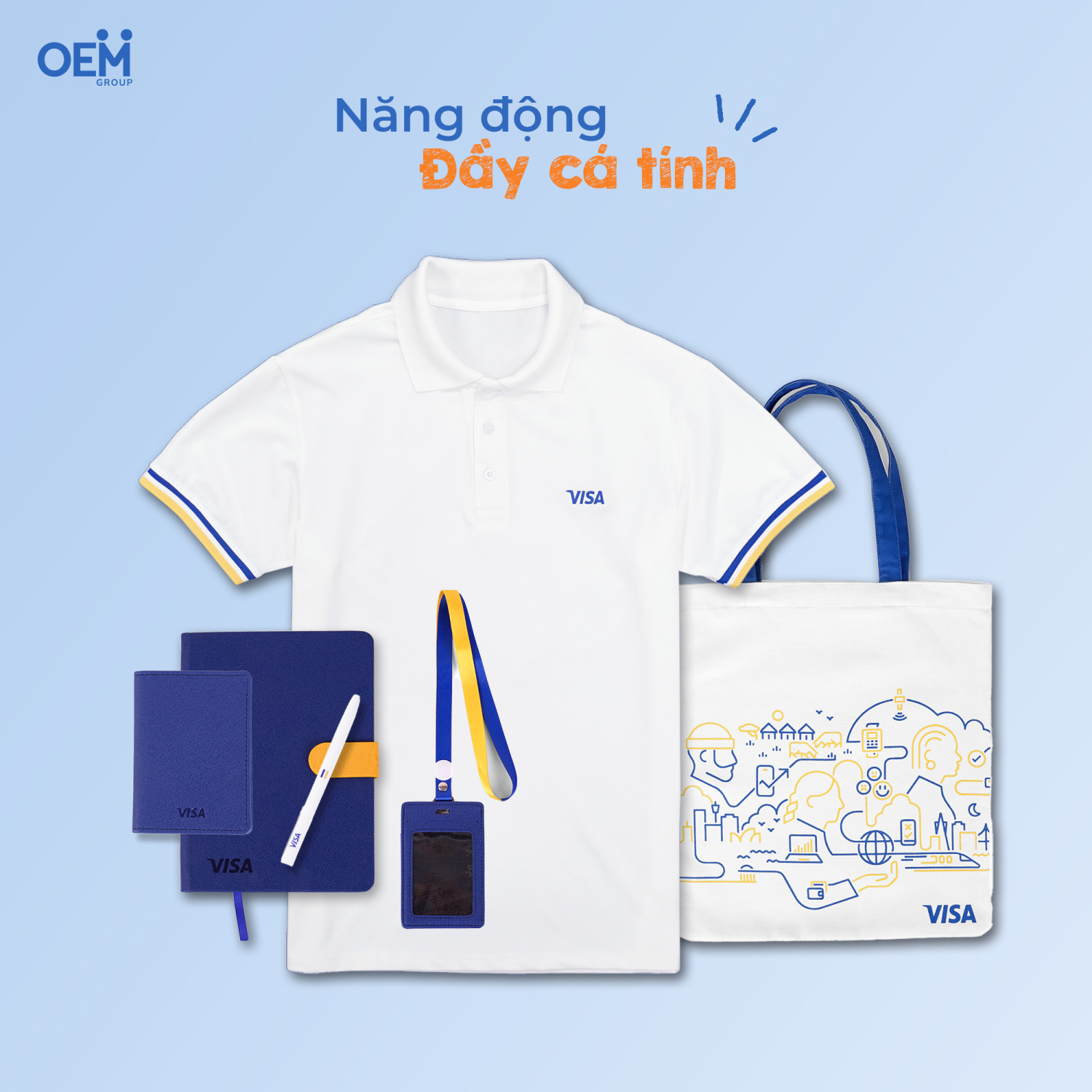 Bộ quà tặng năng động, đầy cá tính này gồm áo polo tay ngắn in logo, sổ tay và bút, dây đeo thẻ, bìa hộ chiếu, túi tote.