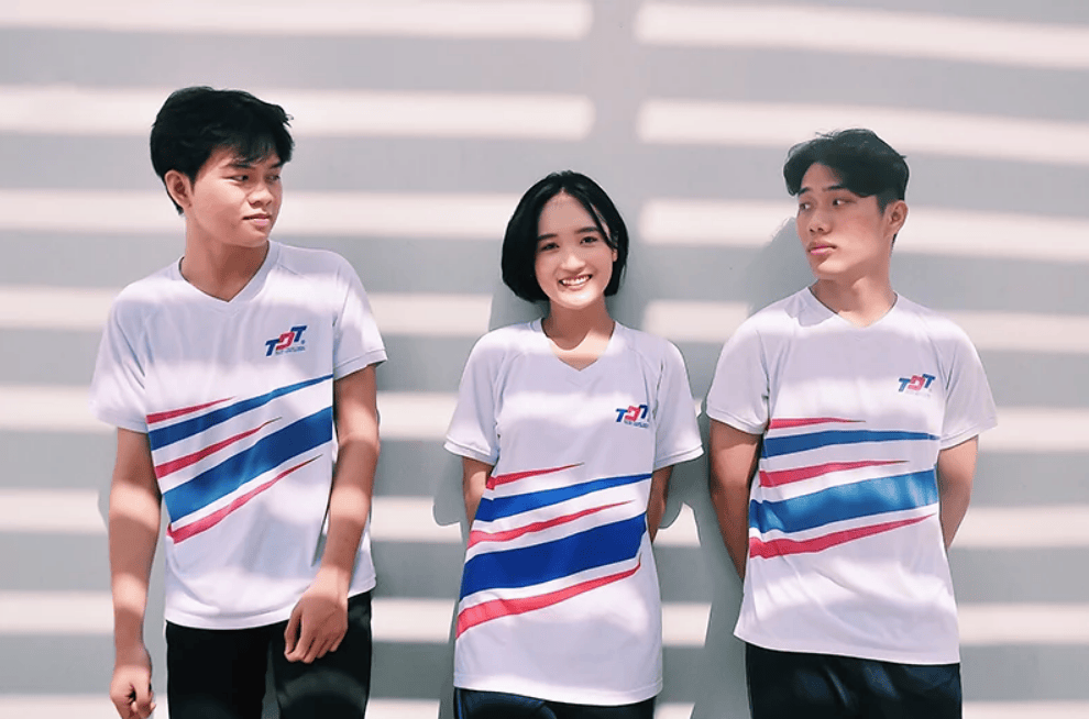 Cuối cùng chính là mẫu áo đồng phục thể dục đến từ trường Đại học Tôn Đức Thắng, với gam màu trắng chủ đạo kết hợp cùng các đường sọc xanh, đỏ làm nổi bật lên logo của trường. Đằng sau áo là dòng chữ “Ton Duc Thang University” với hai gam màu đỏ và xanh dương vô cùng hút mắt, đặc biệt áo được may bằng vải thun mè co giãn, thấm hút mồ hôi tốt, mang lại cảm giác thoải mái cho người mặc.