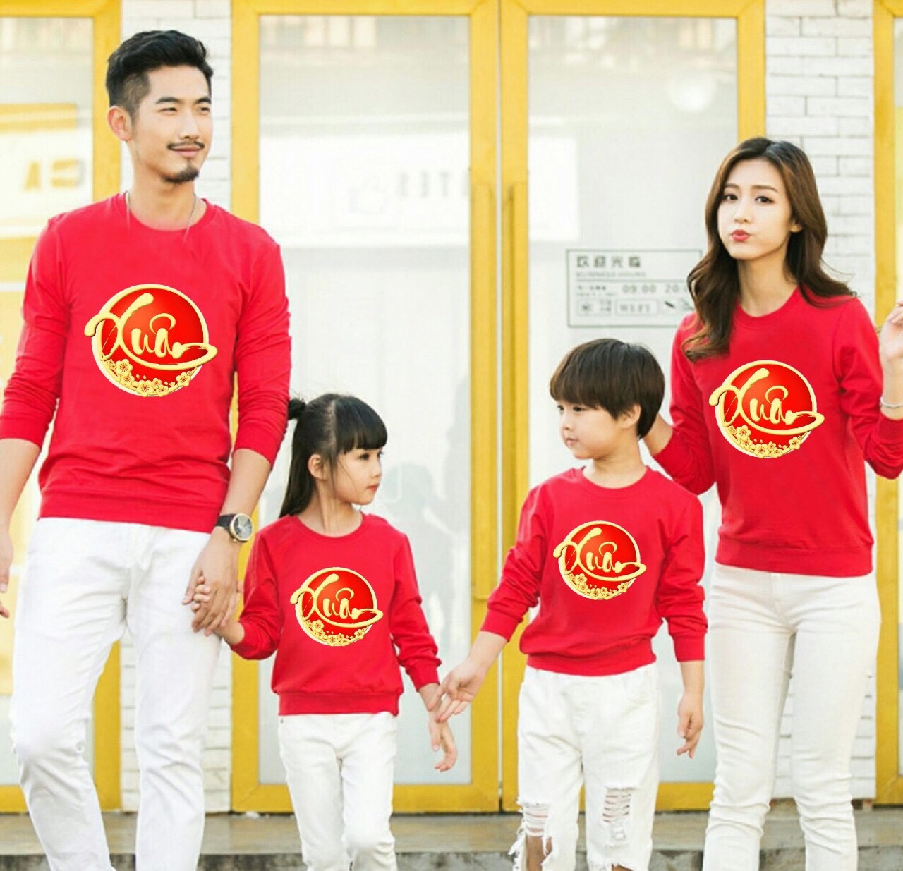 Tone màu đỏ luôn là gợi ý hàng đầu cho các bộ đồng phục gia đình dịp tết